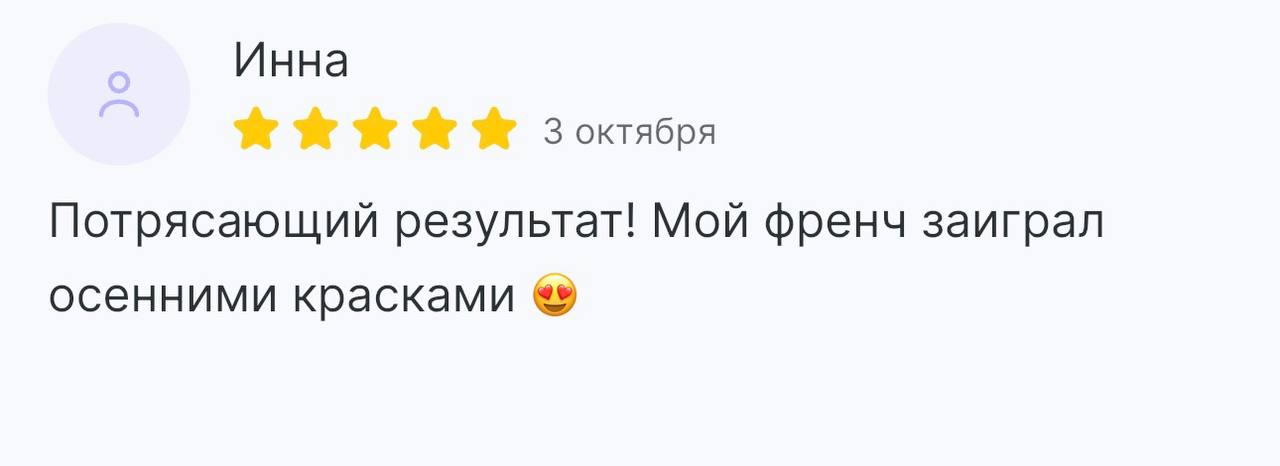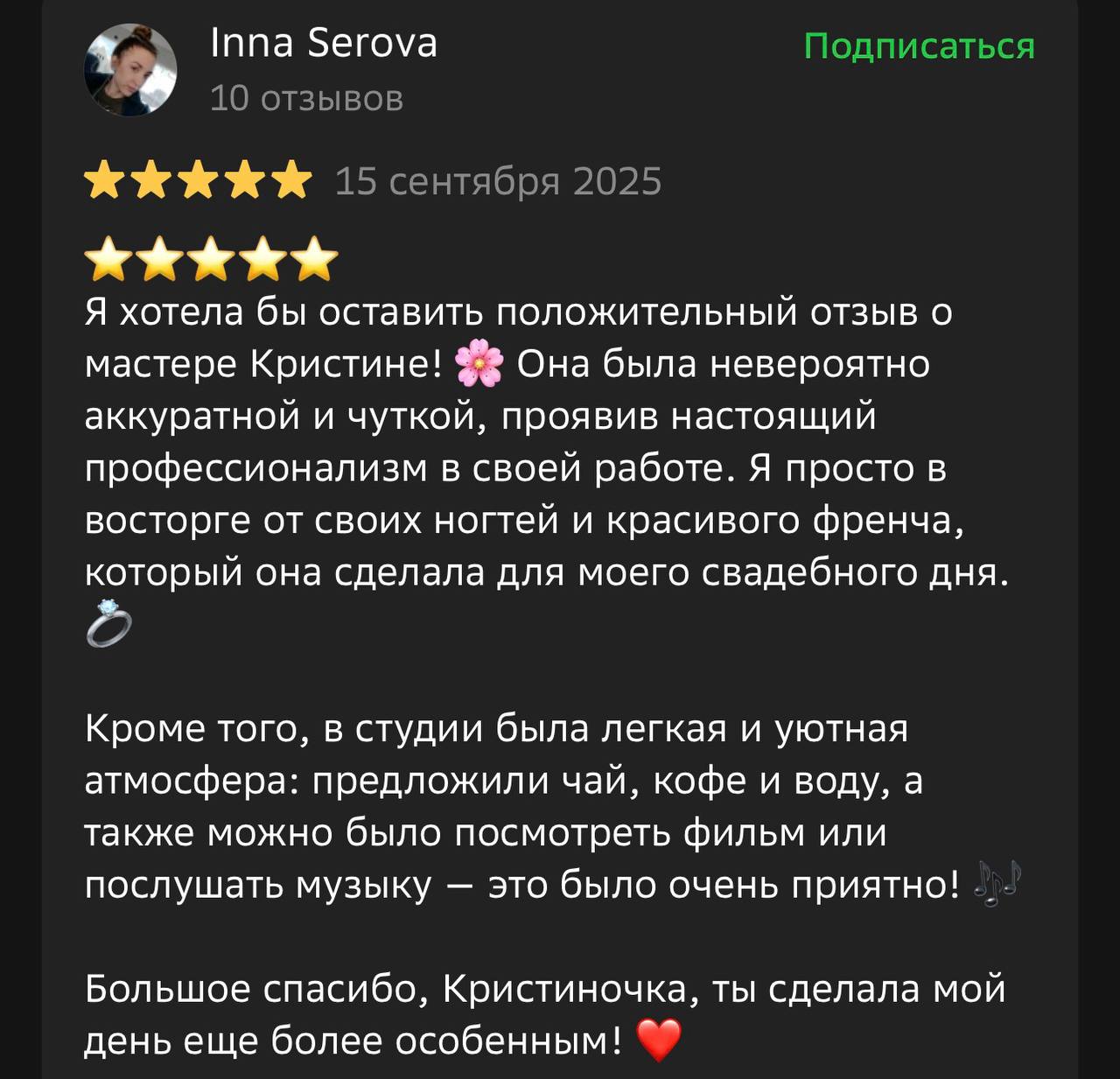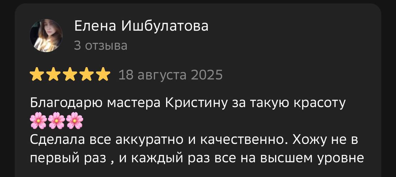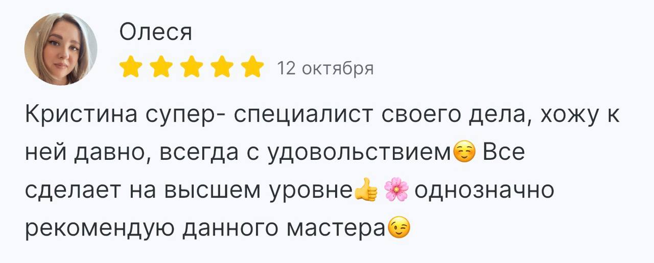 Кристина — мастер, который объединяет высокое качество, чувство стиля и заботу о каждом клиенте. Выполняет современные техники маникюра и педикюра, владеет профессиональными методами подологического ухода. Умеет подобрать форму и цвет покрытия, идеально подходящие под образ и характер клиента. Атмосфера на её процедурах всегда спокойная, комфортная и вдохновляющая.