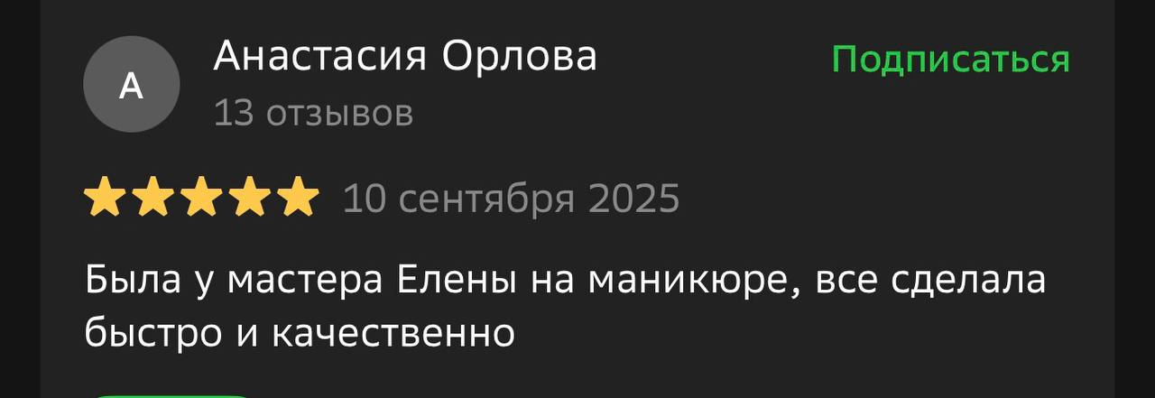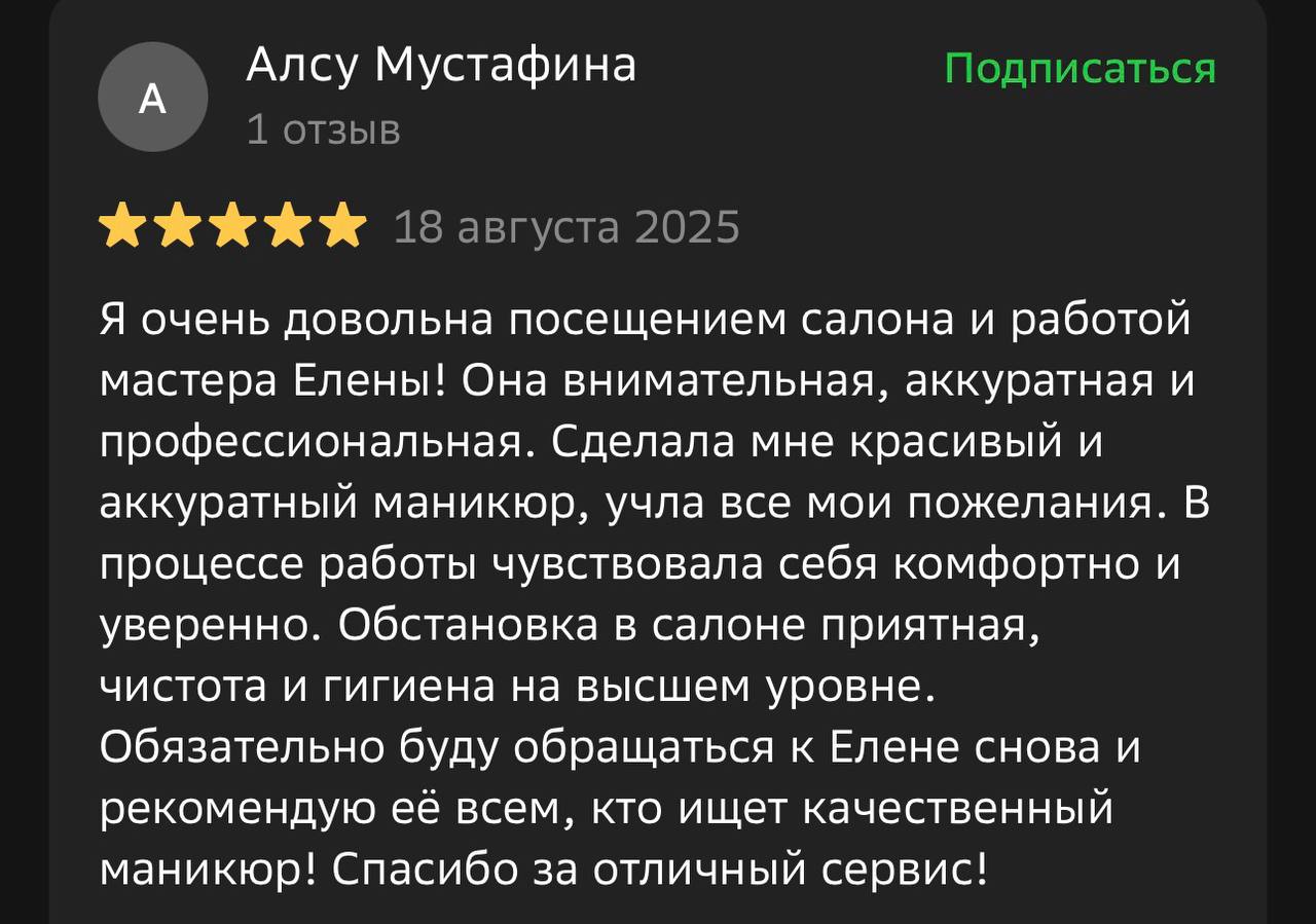 Елена — настоящий эксперт по уходу за руками и ногами. Специализируется на аппаратных и комбинированных техниках маникюра и педикюра, а также профессиональной подологии. Её клиенты отмечают идеальную чистоту, внимательность и аккуратность в работе. Елена помогает не только сделать ногти красивыми, но и восстановить здоровье стоп, вернуть комфорт и уверенность в себе.