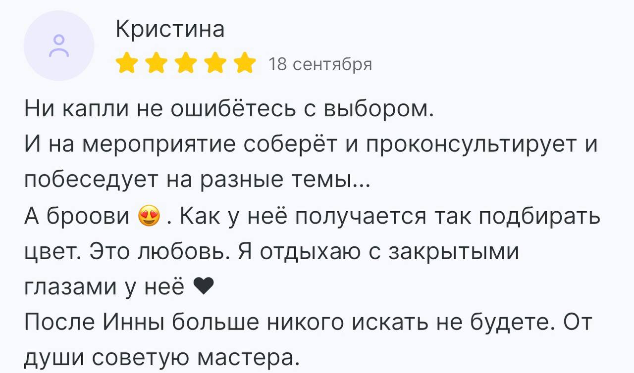 Инна — мастер, создающий индивидуальный образ с акцентом на естественную красоту. Идеально подбирает форму бровей, выполняет окрашивание, ламинирование ресниц и профессиональный макияж для любого случая. Тонко чувствует черты лица и умеет подчеркнуть достоинства, сохраняя гармонию и естественность. После её работы клиенты чувствуют себя уверенно и прекрасно выглядят в любой ситуации.